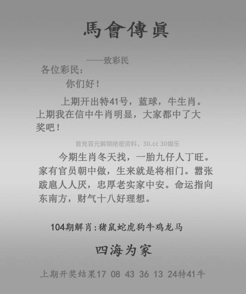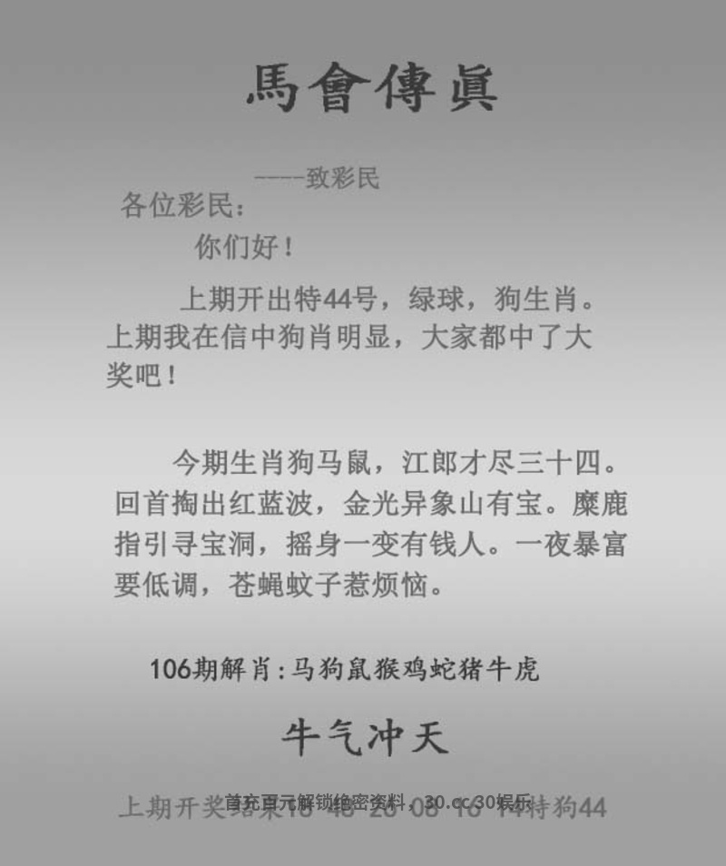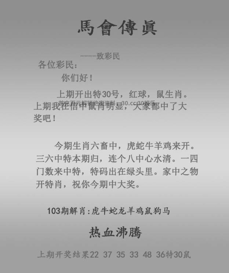 103期马会传真: 今期生肖六畜中,虎蛇牛羊鸡来开 三六中特本期归,连个八中心水清 一四门数来中特,特码出在绿头里 家中之物开特肖,祝你今期中大奖 热血沸腾 解:今期生肖六畜中,虎蛇牛羊鸡来开,特码出在绿头里解绿肖羊龙牛狗 综合:兔马牛狗猴猪鸡龙鼠 六肖:兔马牛狗猴猪 |