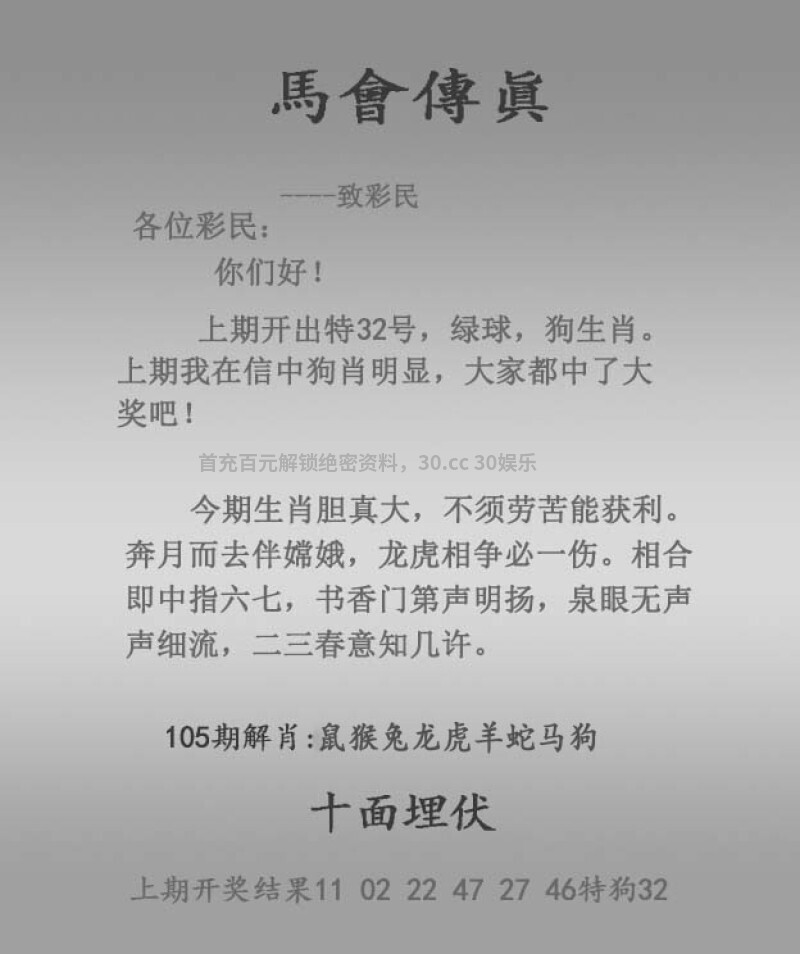 105期马会传真: 今期生肖胆真大,不须劳苦能获利 奔月而去伴嫦娥,龙虎相争必一伤 相合即中指六七,书香门第声明扬 泉眼无声声细流,二三春意知几许 十面埋伏 解:今期龙虎相争必一伤,解凶丑生肖鼠牛虎猴狗猪,书香门第声明扬,解书肖虎龙马 综合:虎牛狗猴羊龙蛇猪鼠 六肖:虎牛狗猴羊龙 |